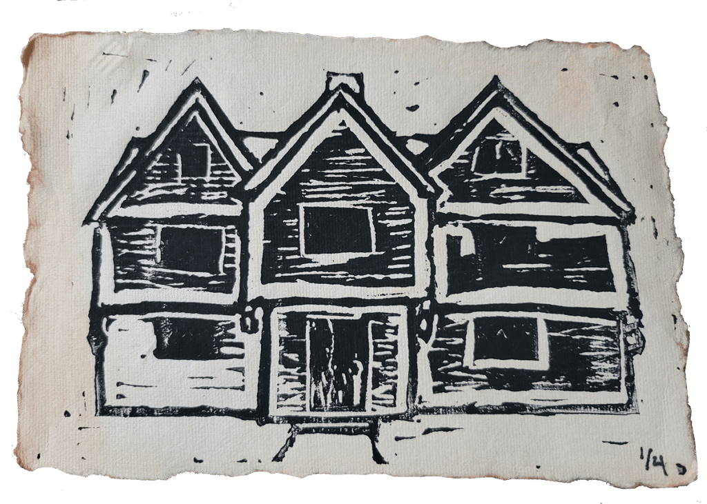 As I was carving this image, you can see I carved out a little too much on the lower left side of the panel. When it happened, I was so upset with myself, but I had to remind myself that this was only my 3rd linocut I’ve ever done. In the future, I can always go back and remake it again if I really don’t love it. But, I came to really love this print. It is cool to see “my” depiction of the Witch House since it has been photographed by millions of people where it all looks the same. This, is all uniquely “mine.”